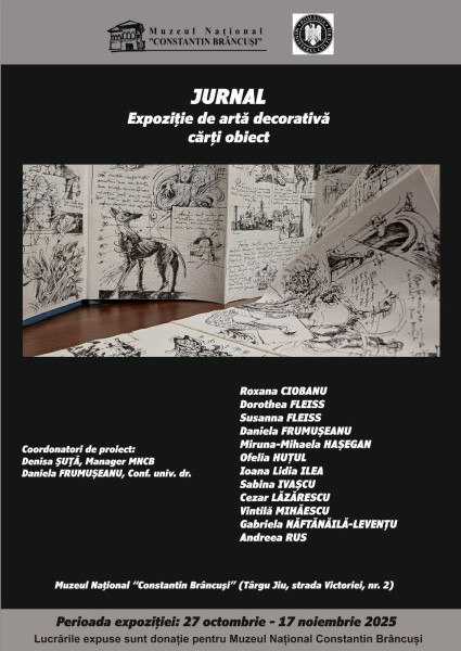 De luni, 27 octombrie, Muzeul Național „Constantin Brâncuși” din Târgu Jiu găzduiește expoziția „Jurnal”, ce prezintă lucrări de artă decorativă sub forma cărților obiect. Aceste piese au devenit recent parte a patrimoniului locației, reunind creațiile mai multor artiști contemporani.