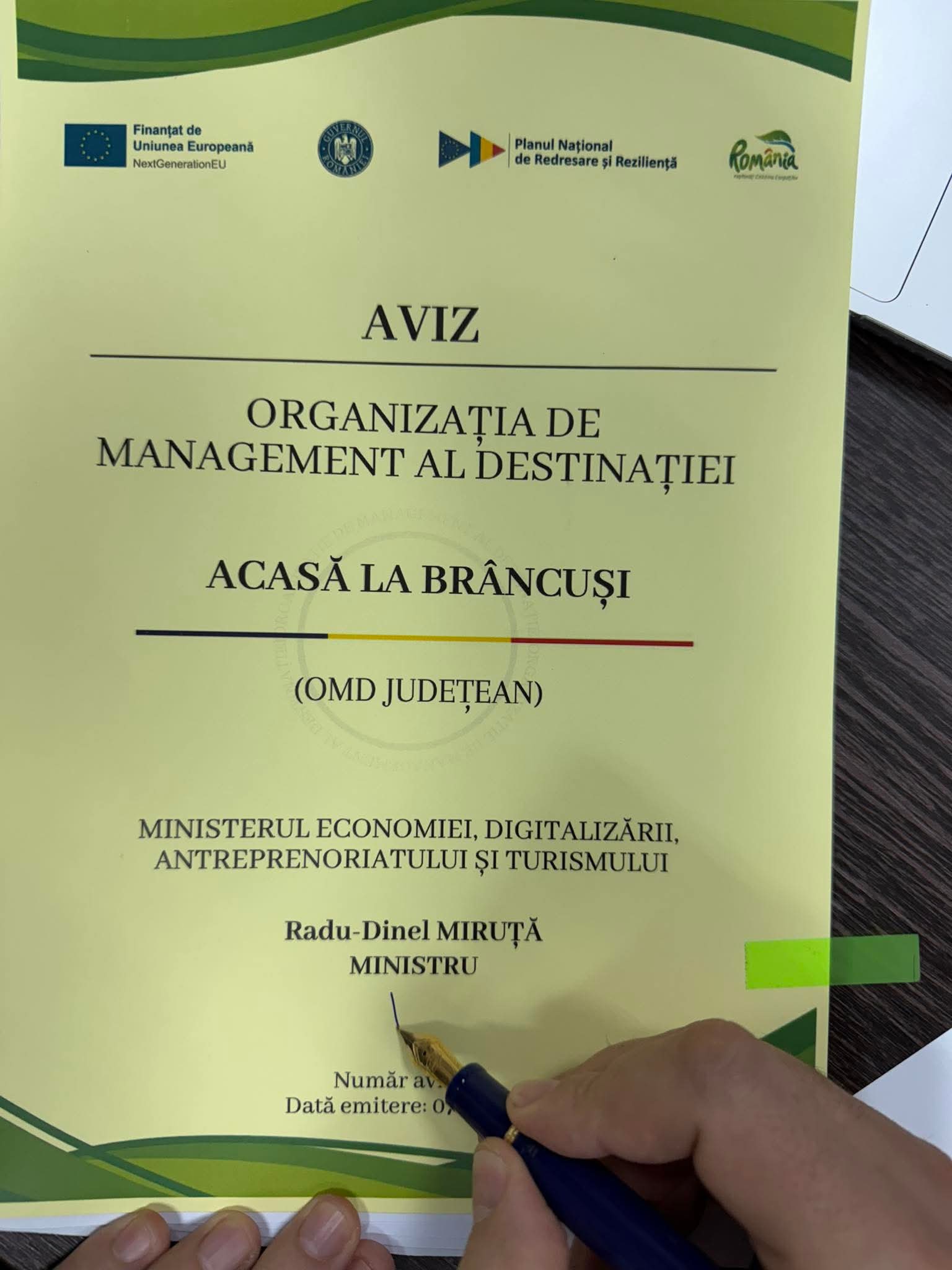 Ministrul Economiei, Radu Miruță, a dat undă verde înființării organizației de management al destinației (OMD) „Acasă la Brâncuși”, care va gestiona și promova zona culturală dedicată sculptorului din Gorj. El a calificat acest moment drept „o semnătură mai specială”.